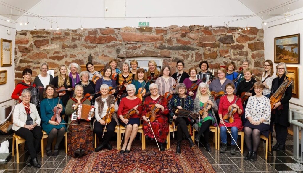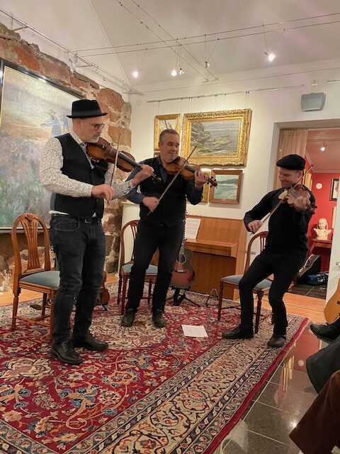 Den sydösterbottniska folkmusikgruppen I fäälan uppträder i samband med en låtkurs som Kvinnfolk ordnade 2023.